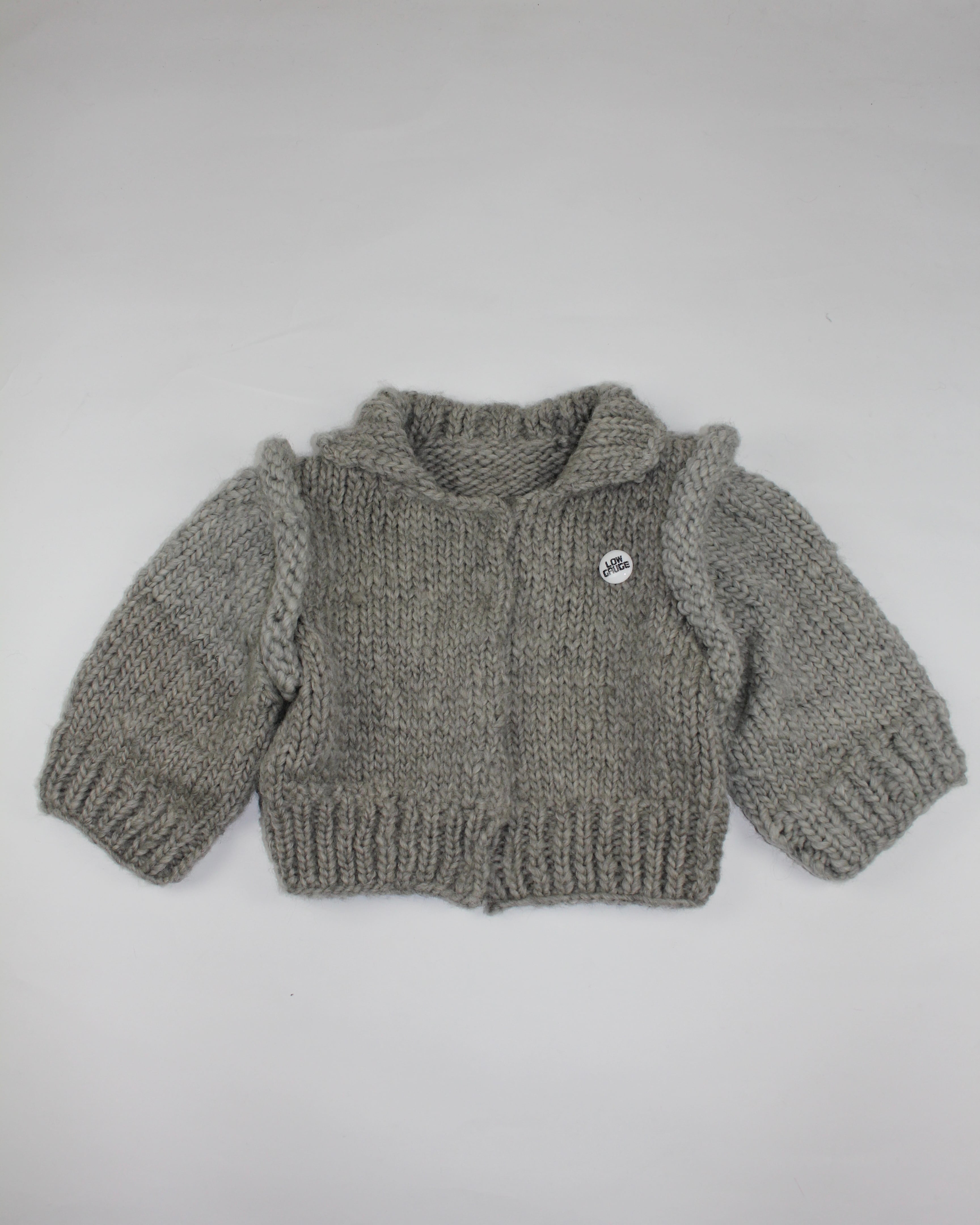 This hand-knitted jacket is made using rare Cowichan yarn. It features a short length and voluminous shoulders. It has snap buttons.